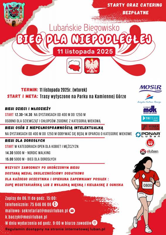 - Zgłoszenia do biegu poprzez formularze zgłoszeniowe dostarczone do szkół, mailowo sekretariat@misirluban.pl, k.baczyk@mosirluban.pl , tel 75 646 06 06, osobiście w siedzibie MOSIR, ul. Ludowa w godz. 8.00 – 15.00 w dni robocze do 7.11.2025 do godz. 15.00