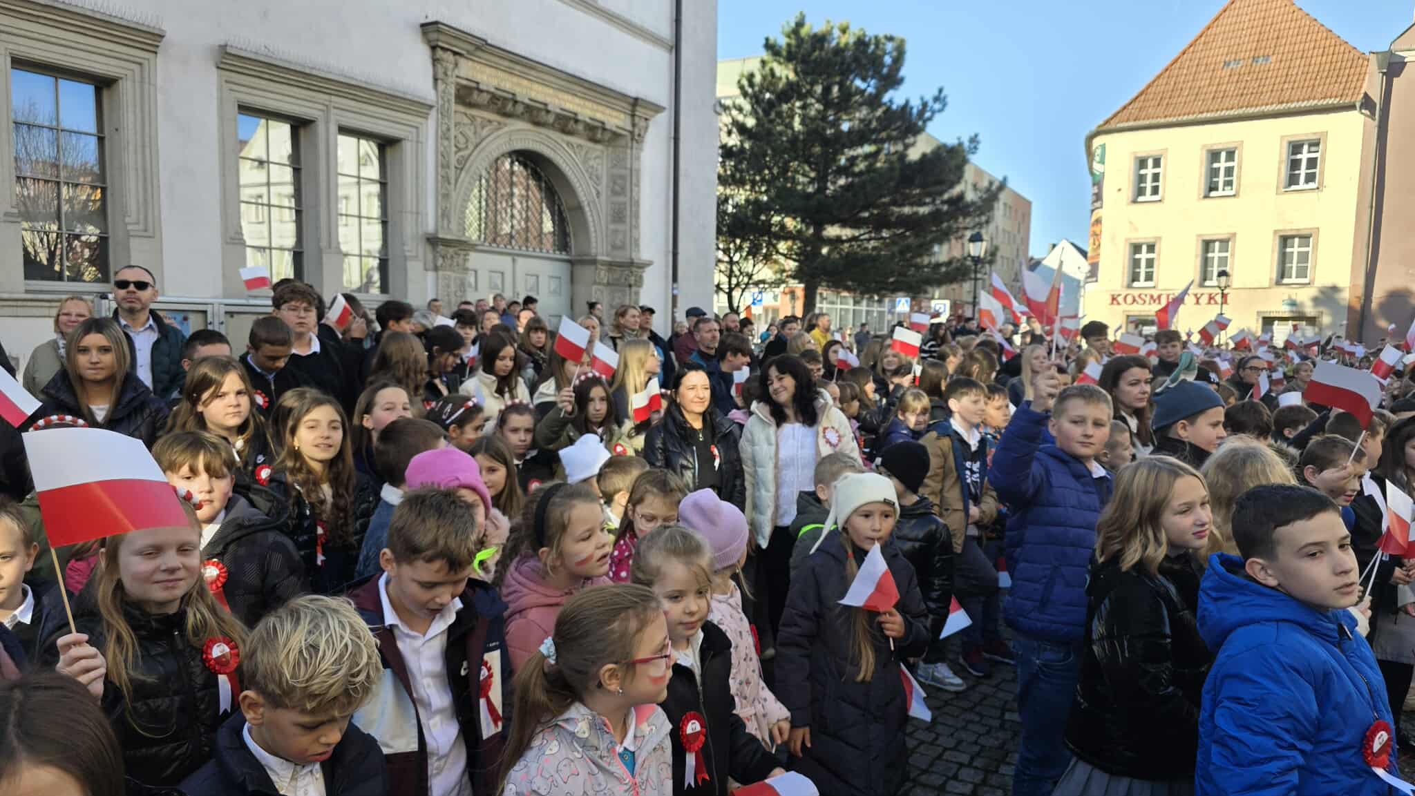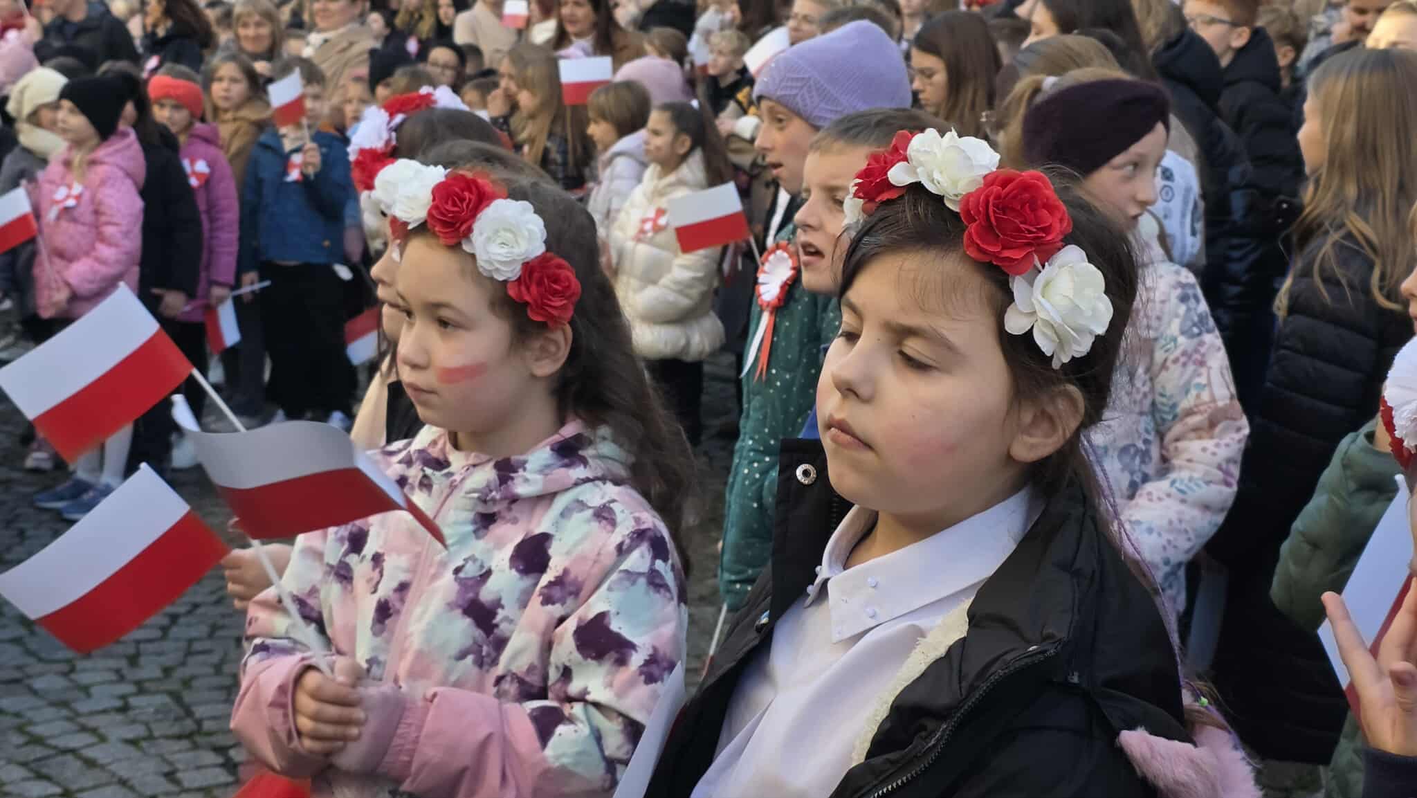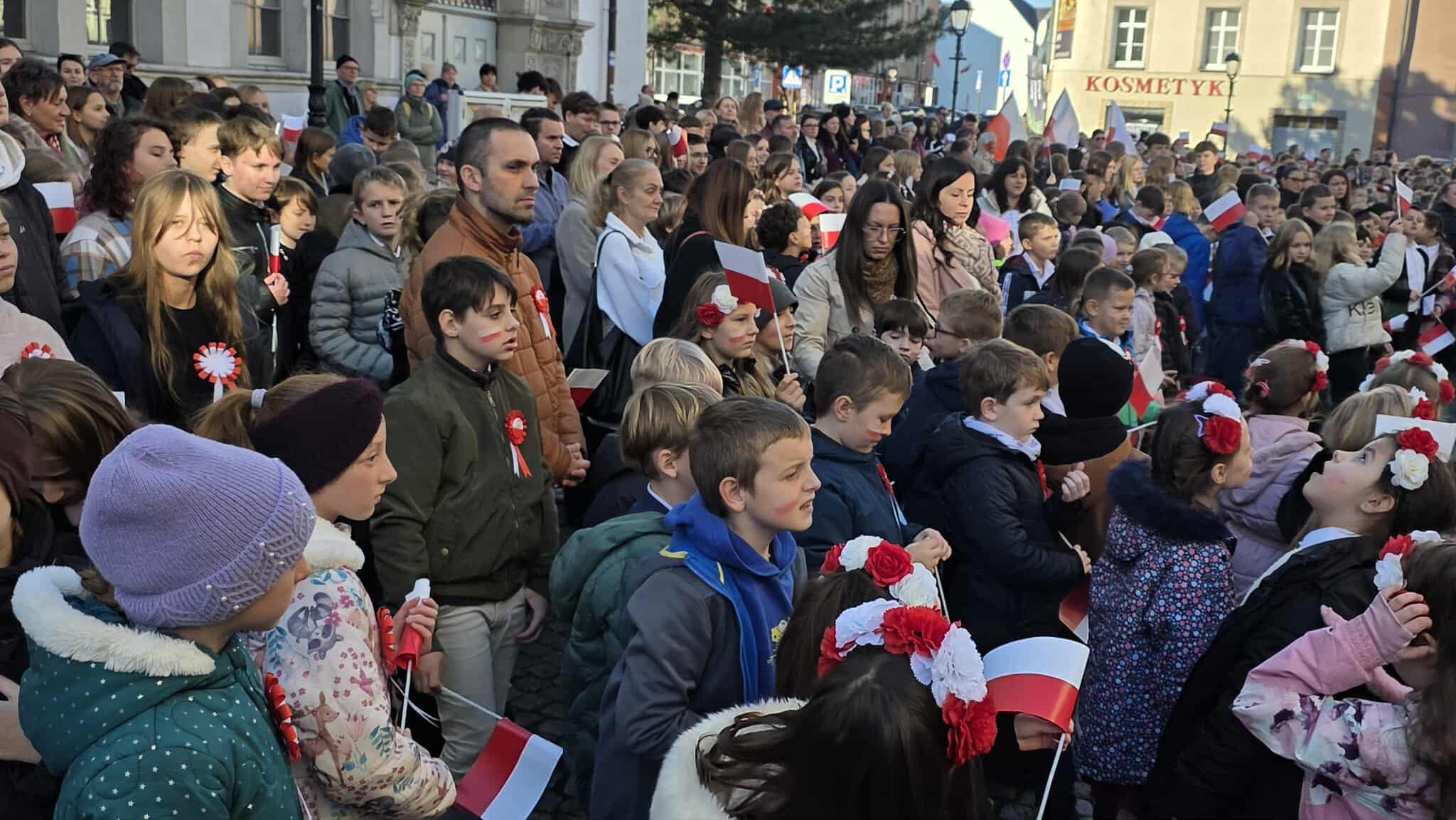 7 listopada, na Rynku, kl. 1-8 z SP1 (wraz z wychowawcami i p. Beatą Myśliwiec – dyrektor placówki) uczestniczyły w miejskich obchodach 107. rocznicy odzyskania przez Polskę niepodległości. W ich trakcie dokładnie o 11:11 wszyscy razem odśpiewaliśmy nasz hymn narodowy, czyli „Mazurka Dąbrowskiego”, w ramach ogólnopolskiej akcji MEN „SZKOŁA DO HYMNU” (organizowanej już po raz ósmy). Było głośno, radośnie, galowo – z chorągiewkami i kokardami narodowymi. W ten właśnie sposób wspólnie oraz doniośle uczciliśmy Narodowe Święto Niepodległości 11 listopada.
