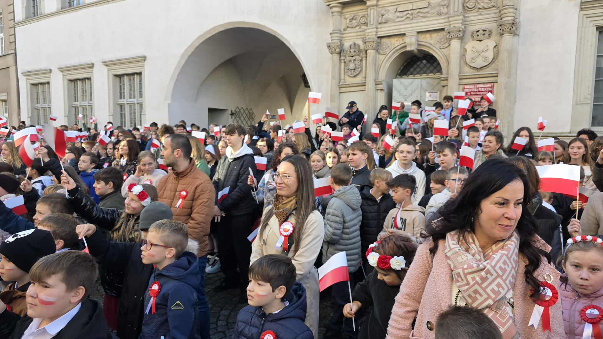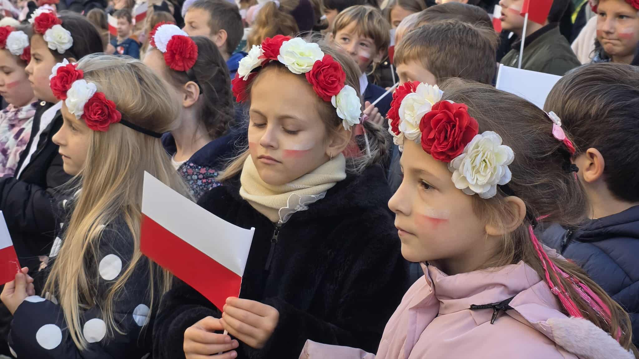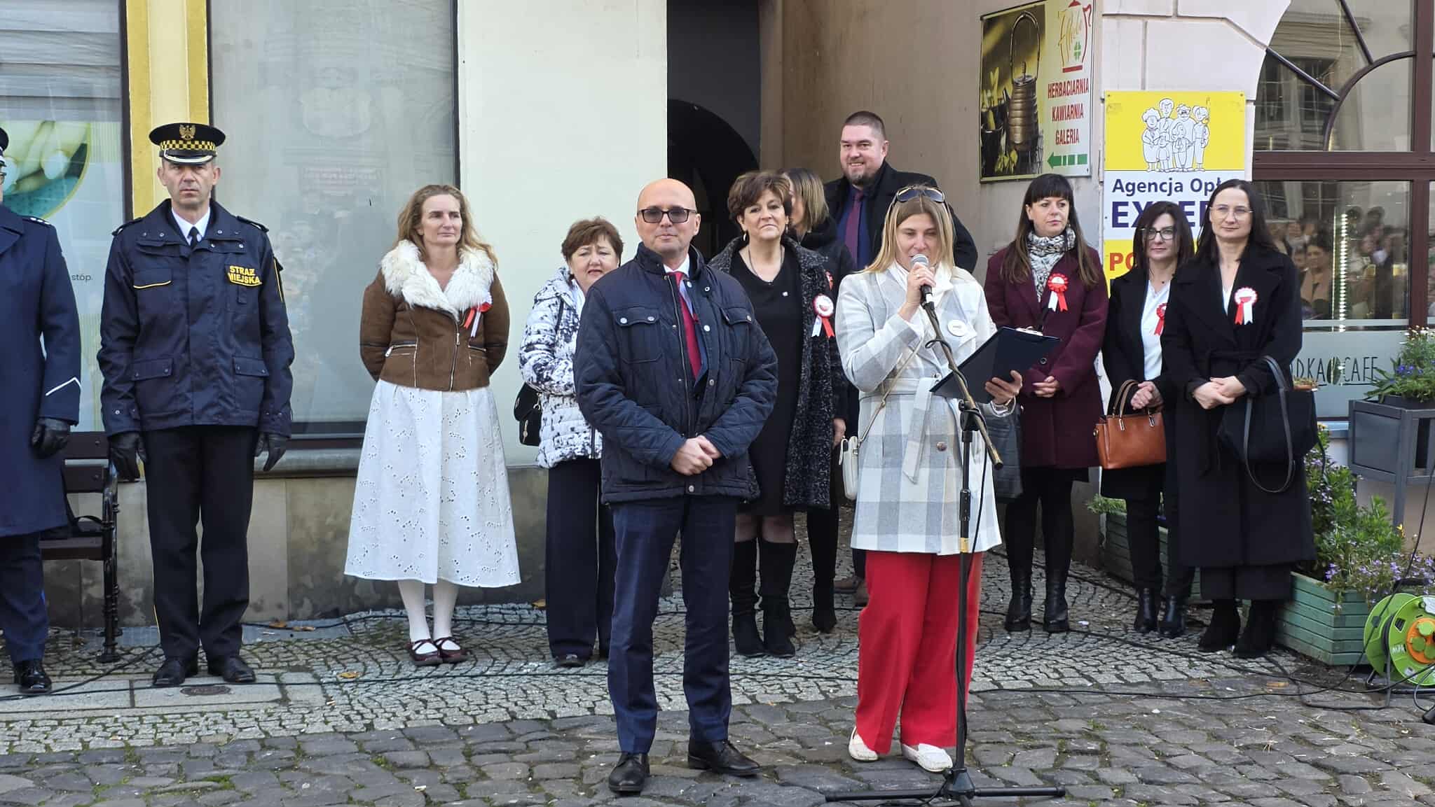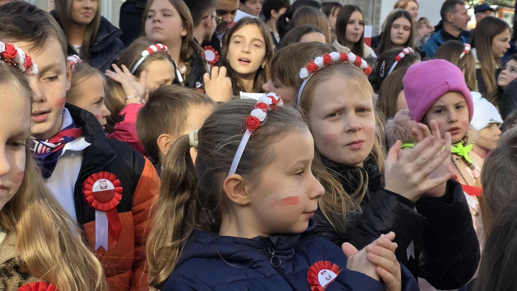 7 listopada, na Rynku, kl. 1-8 z SP1 (wraz z wychowawcami i p. Beatą Myśliwiec – dyrektor placówki) uczestniczyły w miejskich obchodach 107. rocznicy odzyskania przez Polskę niepodległości. W ich trakcie dokładnie o 11:11 wszyscy razem odśpiewaliśmy nasz hymn narodowy, czyli „Mazurka Dąbrowskiego”, w ramach ogólnopolskiej akcji MEN „SZKOŁA DO HYMNU” (organizowanej już po raz ósmy). Było głośno, radośnie, galowo – z chorągiewkami i kokardami narodowymi. W ten właśnie sposób wspólnie oraz doniośle uczciliśmy Narodowe Święto Niepodległości 11 listopada.