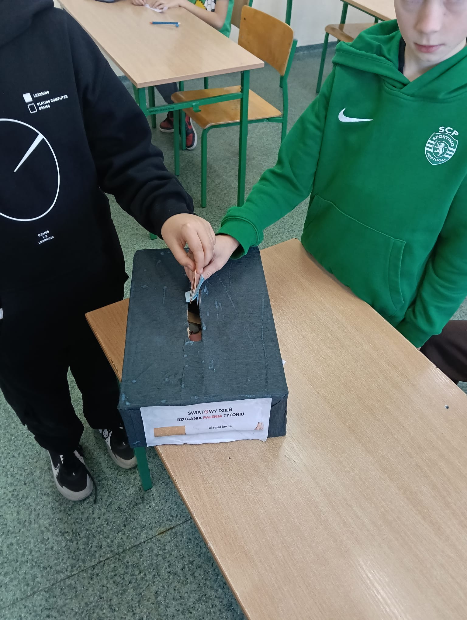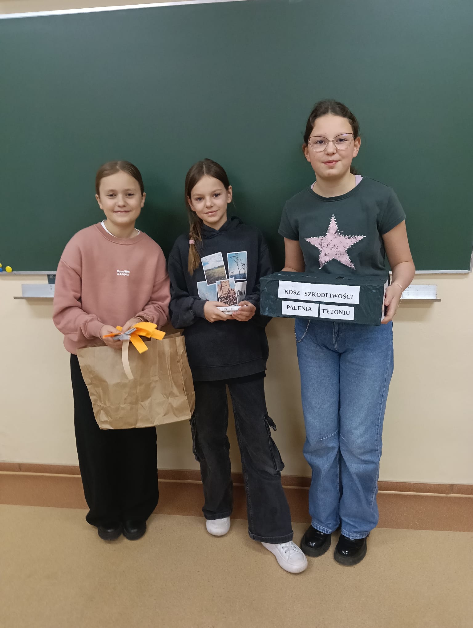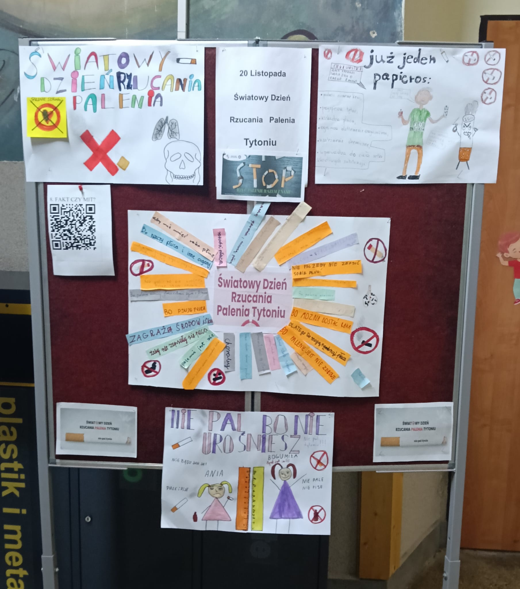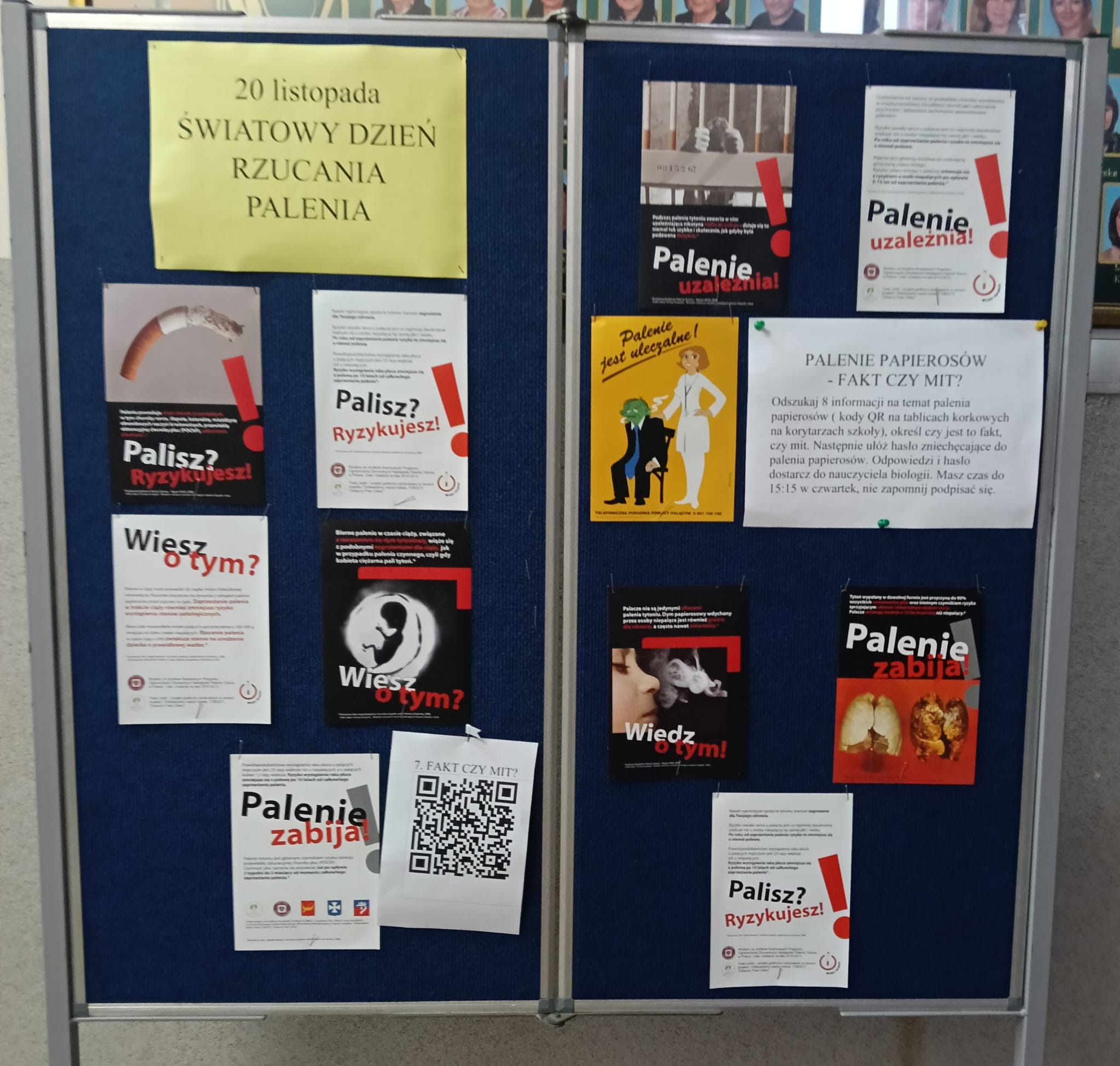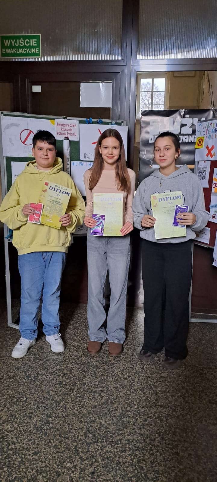Ponadto przygotowano gazetkę z faktami naukowymi na temat szkodliwości palenia. Jednym z elementów wydarzenia była także korytarzowa gra edukacyjna zorganizowana przez panią Izabelę Biezę-Waśniewską. Na poszczególnych piętrach ukryto kody QR z informacjami o paleniu, a zadaniem uczniów było odnalezienie ich, ocena, czy przedstawiają fakt czy mit, a następnie stworzenie własnego hasła zniechęcającego do sięgania po papierosy. Najlepiej poradziła sobie drużyna z klasy VII c: Aleksander Szewczyk, Martyna Kryłowicz i Maja Atanowska. Gratulujemy zwycięzcom i dziękujemy wszystkim za aktywne zaangażowanie!