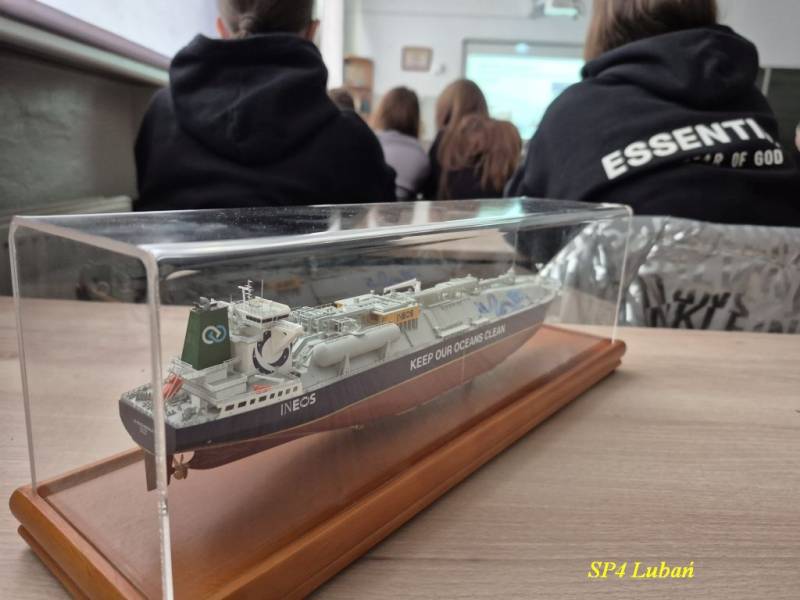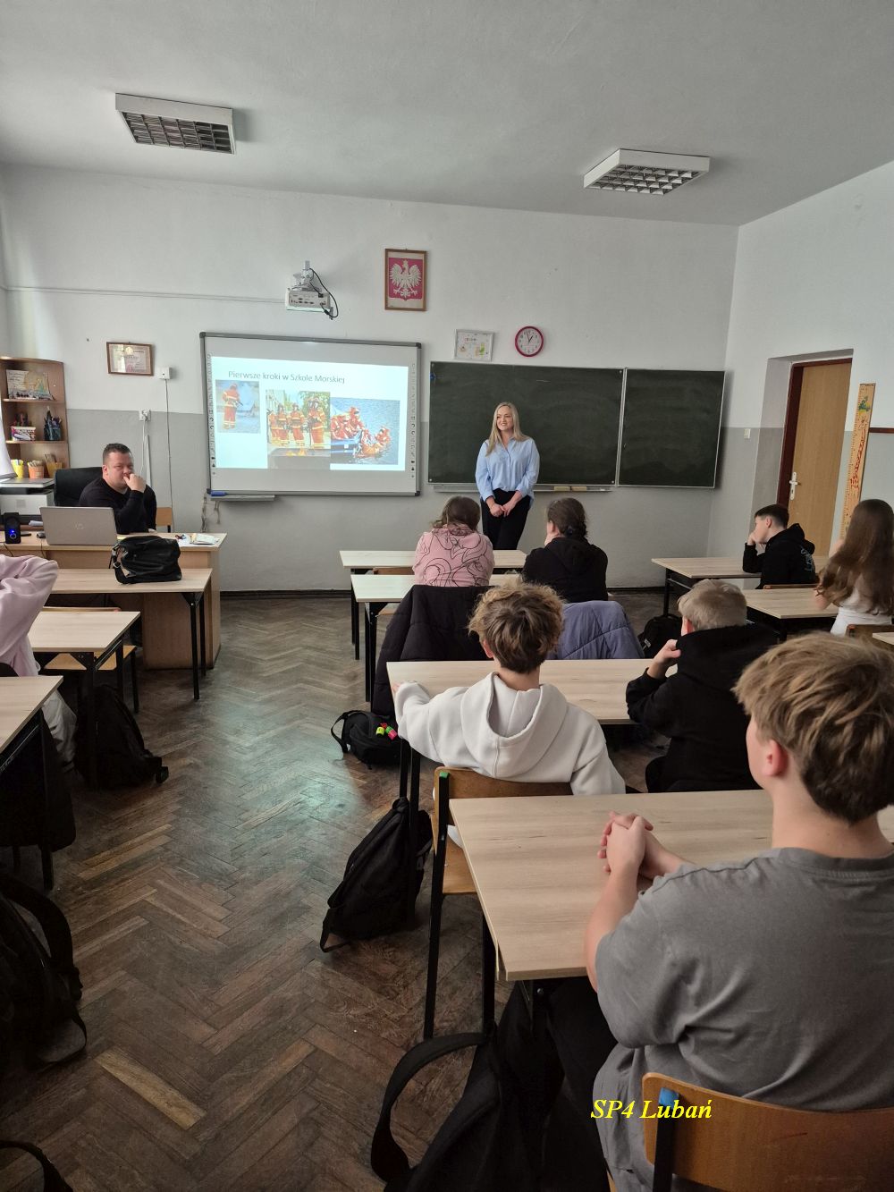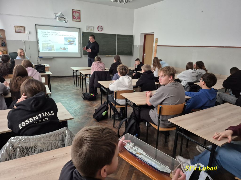 Opowiadali oni młodym ludziom  o pracy na morzu. Pani Anita przygotowała informacje o wyższych szkołach morskich w Szczecinie i Gdyni, opowiedziała o specyfice studiów w tego typu placówce edukacyjnej, bowiem razem z mężem są absolwentami Politechniki Morskiej w Szczecinie. Państwo Kędzierscy w ciekawy sposób opowiadając o własnych doświadczeniach, zaznajamiali uczniów ze specyfiką pracy na statkach. Pan Artur, który nadal pracuje jako kapitan prowadzący statki, opowiadał o swoich doświadczeniach związanych z tym zawodem. Jak dowiedzieli się uczniowie praca na statku może być także okazją do zwiedzania różnych zakątków świata, poznawania ludzi oraz doskonalenia się w wielu umiejętnościach. Była to idealna lekcja doradztwa zawodowego, przeprowadzona z pasją i profesjonalizmem. Dziękujemy!