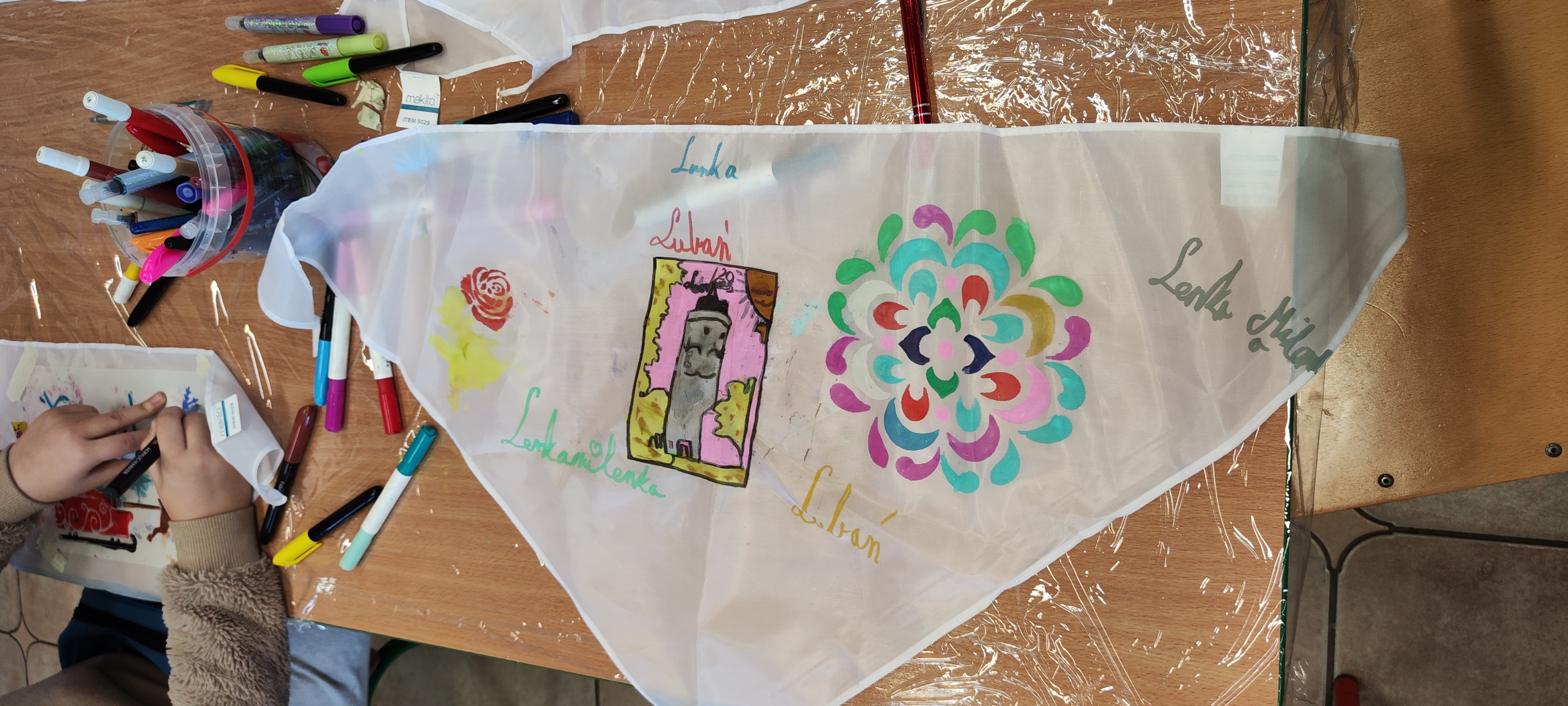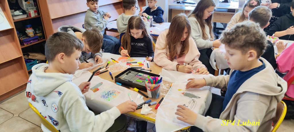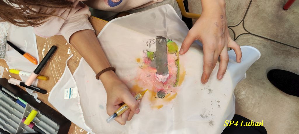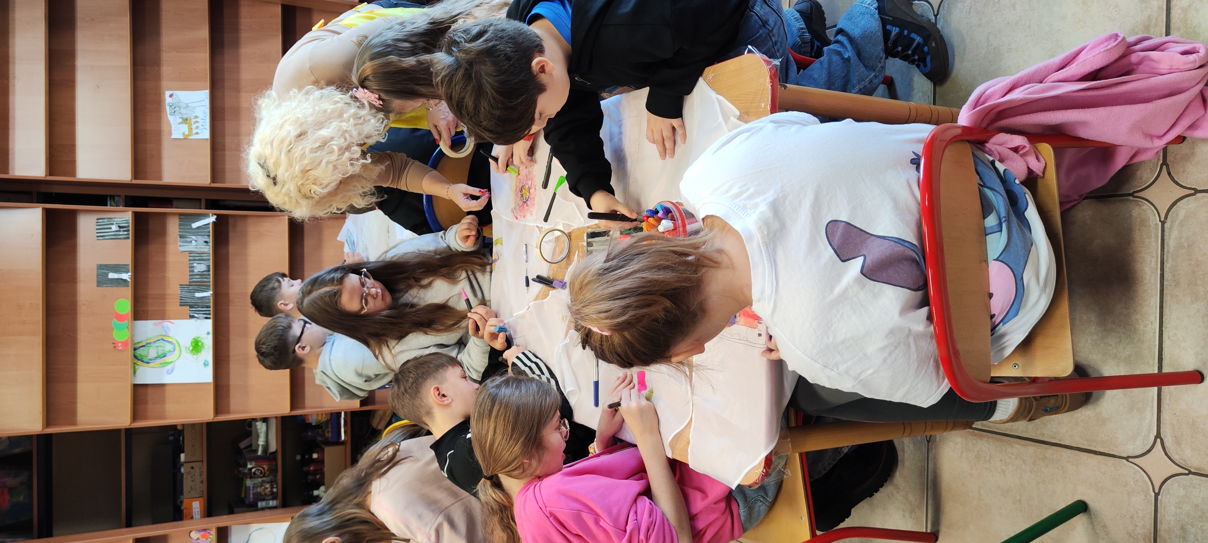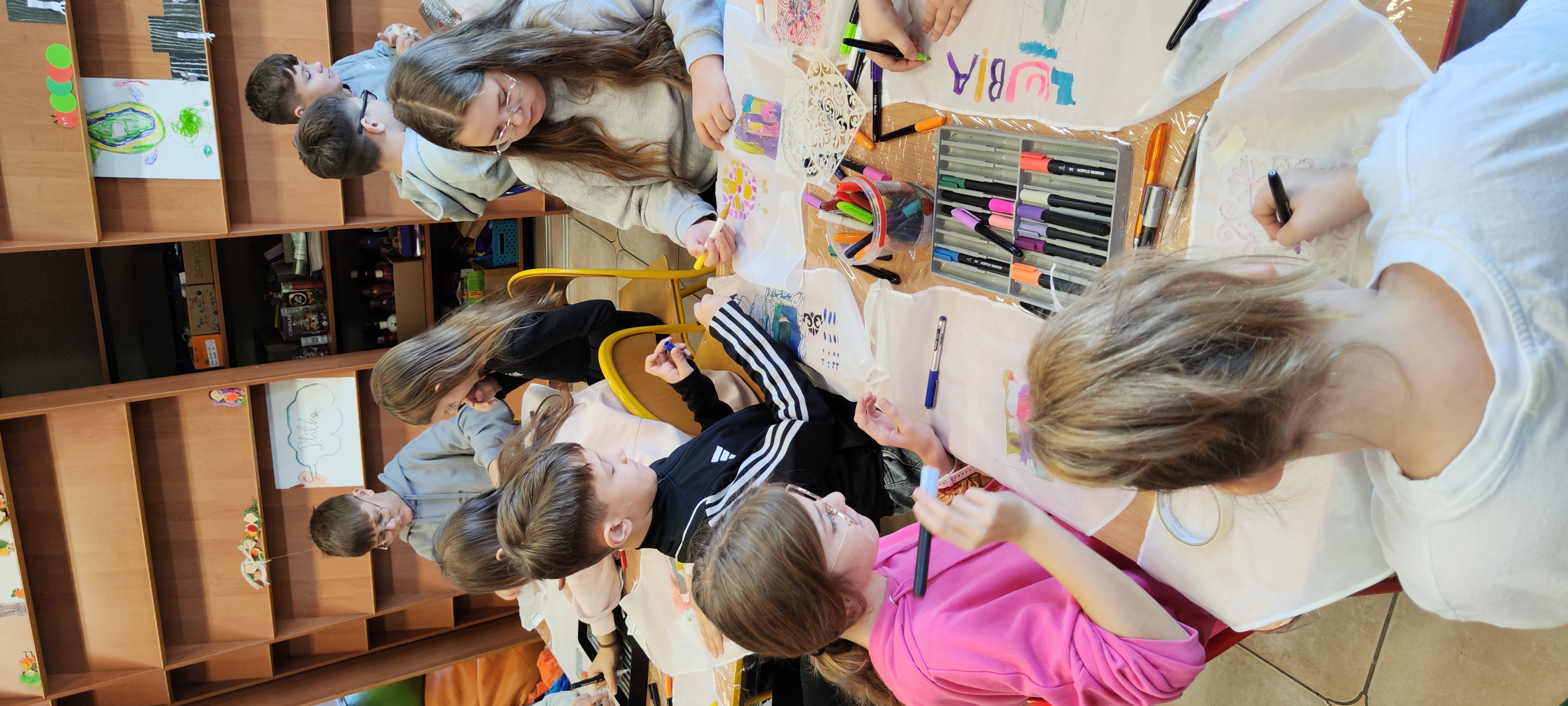 Tematem zajęć były ozdobne torby z motywem wieży brackiej – jednego z najbardziej charakterystycznych symboli naszego miasta. Pod okiem pani prowadzącej uczniowie pracowali zarówno z przygotowanymi szablonami, jak i własnymi, całkowicie autorskimi pomysłami. Dzięki temu każda torba nabrała indywidualnego charakteru: obok tradycyjnej wieży pojawiały się barwne wzory i motywy wymyślone przez młodych twórców. Efekty ich pracy robiły ogromne wrażenie. Dzieci wykazały się pomysłowością, starannością i odwagą artystyczną. Warsztaty okazały się nie tylko świetną zabawą, ale też inspiracją do dalszych twórczych działań. Bardzo dziękujemy za zaproszenie i możliwość poznania nowych technik plastycznych.